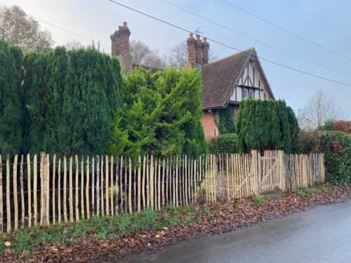 Chestnut poles are split by hand into stout pales, which are bound together with galvanised wire to make rolls of fencing. Strong, durable, quick to erect and difficult to climb, this extremely versatile fencing will stand for many years or can be easily moved or taken down and stored.